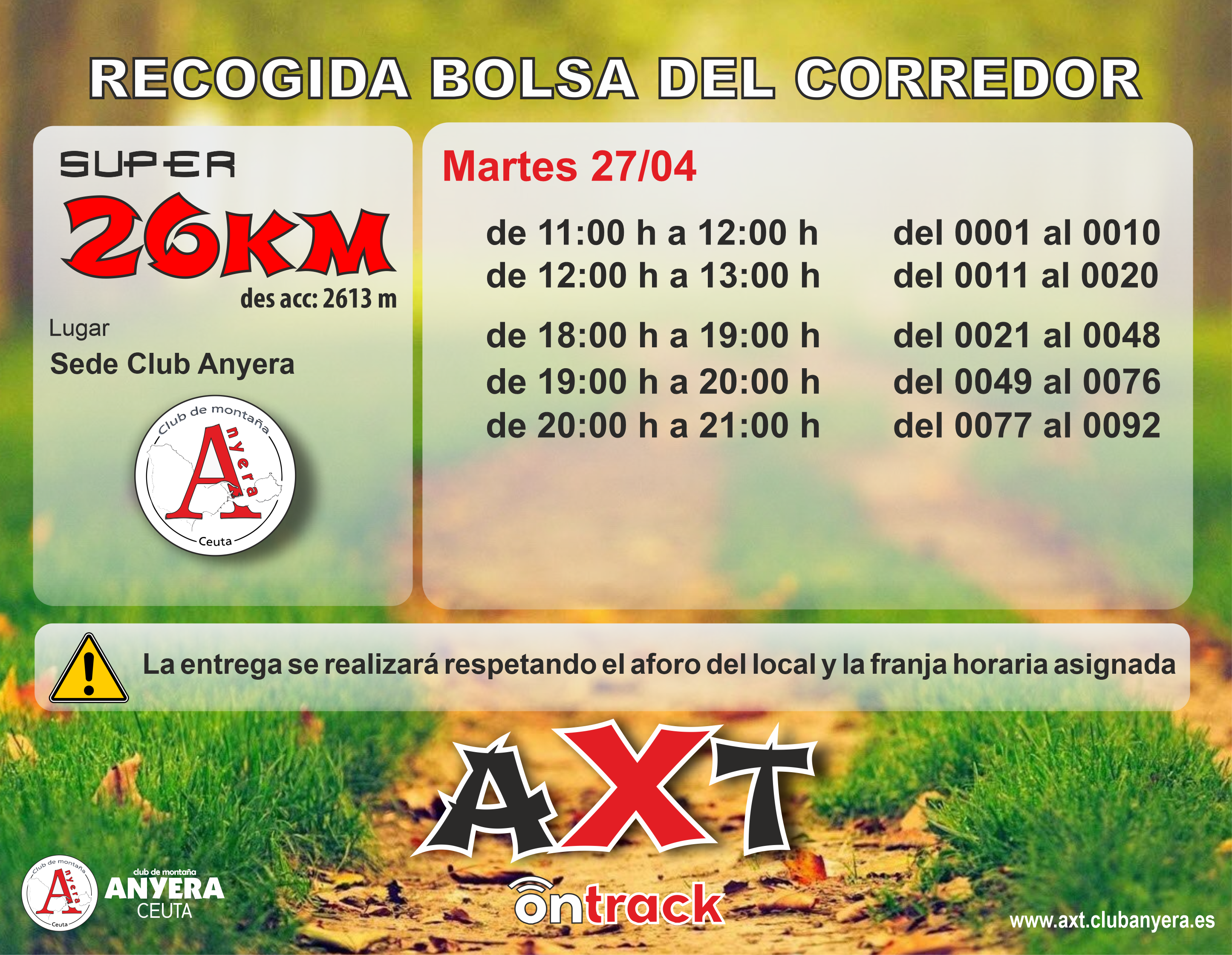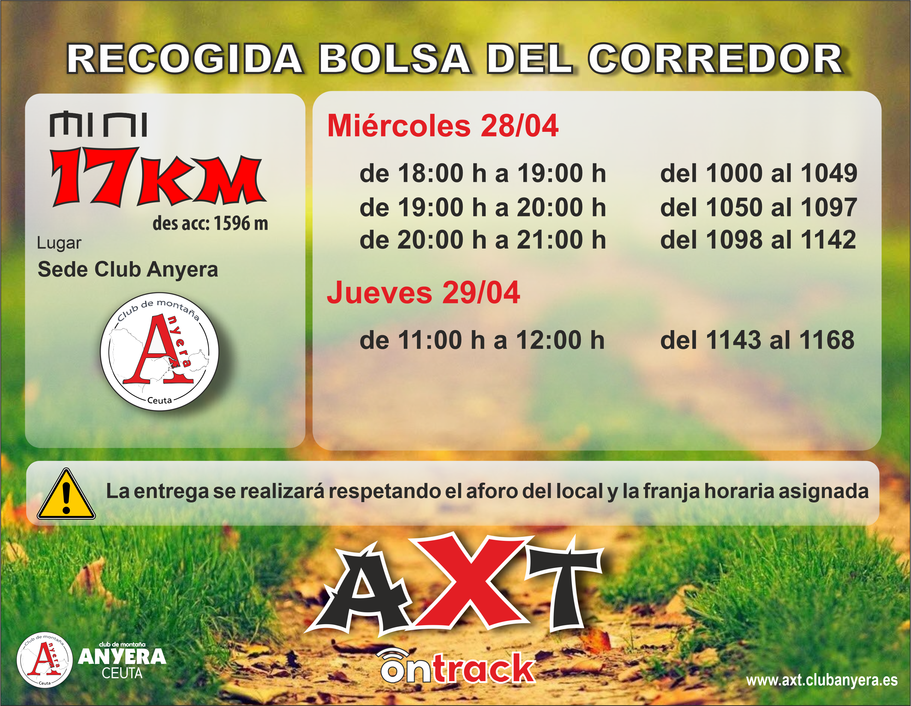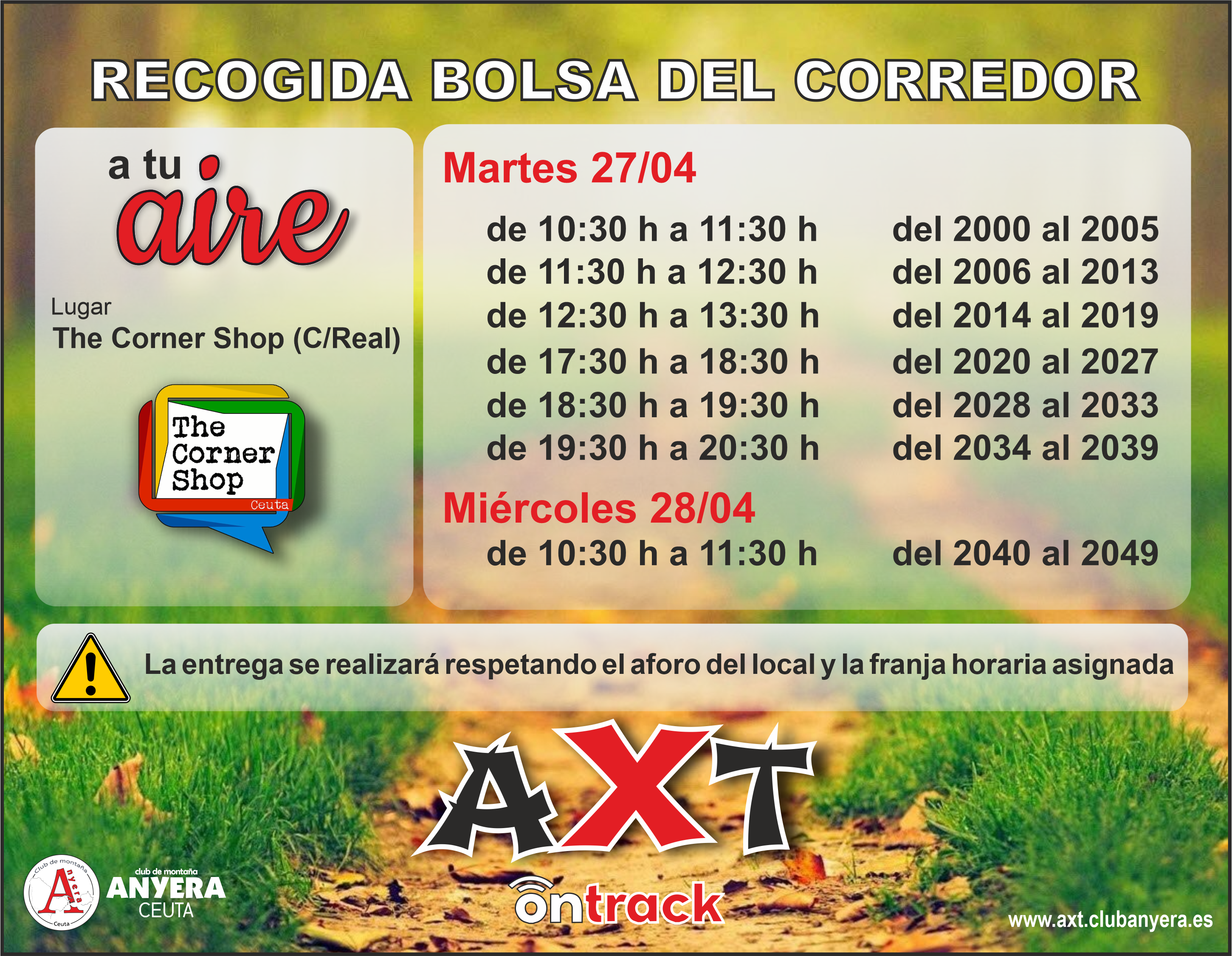 Debido a la situación sanitaria, la recogida de la bolsa del corredor se realizará CON CITA PREVIA que será asignada por la Organización. Para evitar la aglomeración de participantes se facilitan puntos, fechas y horarios de entrega diferentes, en función de la modalidad elegida. No se admiten cambios ni devoluciones del material de la bolsa del corredor.